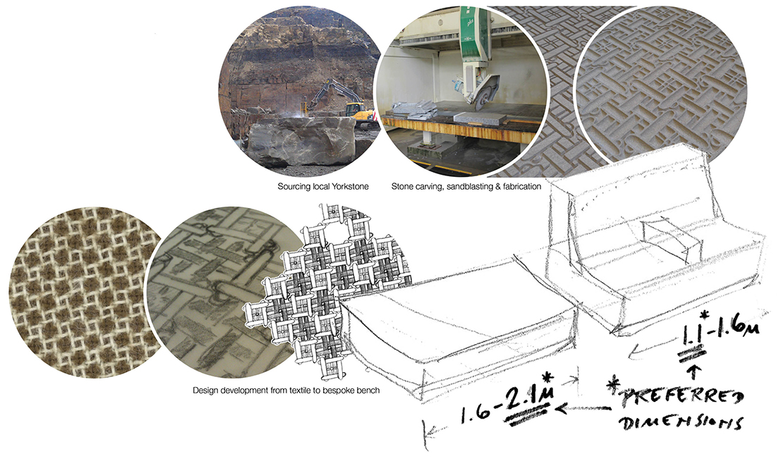 Armley Mills Textile Benches ... the new southern entrance to Leeds Station has been accompanied by significant improvements to the adjoining public realm, and the introduction of new public art features. Our client requested a bespoke bench feature to accommodate incidental or short-term seating which was responsive to the needs of the widest possible range of users. The design response has been a rough-hewn stone slab evoking the strength and elemental character of the foundation of the station. A continuous length of quarried stone will be broken in two, revealing an engraved woven pattern (matching carved and in relief), referencing how deeply ingrained the textile industry has been to the success of Leeds ...